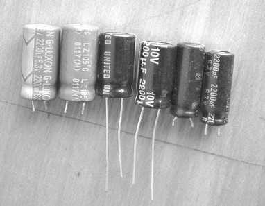 笔者初步判断是这几个电容有问题。在电子市场,咨询了部分经营电容的商家,得出的结论是对这个有电容故障的主板有两个解决方法:1.更换耐压值高一点的同容量电容。2.更换同类型的名牌电容。由于出现这种问题的主板有10多台,而且估计以后肯定还会有类似的情况出现。我购买了两种电容,如图2:
