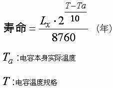 电容扮演着影响系统寿命的关键角色,而影响电容寿命的因素如下:电容的规格、工作温度、电容的摆设位置等等,因此在设计VR的同时,除了这些因素外,我们也要考虑CPU附近空气流动的方向,让空气流吹向电容,降低电容本身温度以延长电容的寿命,电容的寿命计算方式如下: