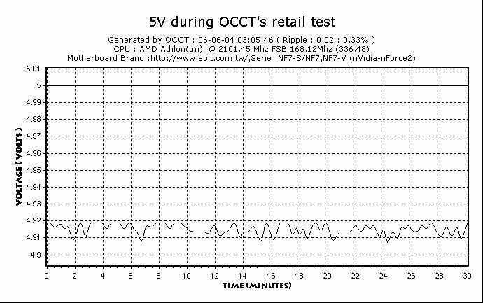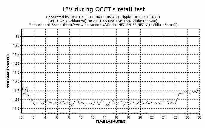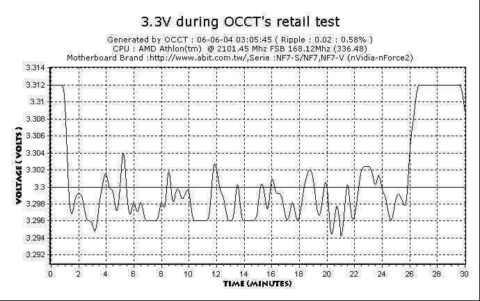我们再来看看+12V的情况(如图2),12V端的Ripple值分别为:0.12,1.04%,+12V最低电压达到11.63V,最高不过11.75V,波动也比较正常。虽然GF5700Ultra显卡使用了一个12V接口,但从图中看出这并没有给电源造成什么负担;+3.3V端主要给显卡和内存供电,从图3中可以看到电压波动也比较正常,不过OCCT在测试时显卡并未处于负荷状态,因此+3.3V端只作为参考,考察电源还是要以+5V和+12V端为主。