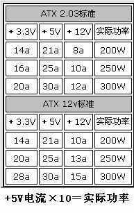 方法二:对于ATX2.02/2.03和ATX 12V 1.1版电源,可以采用+5V输出值乘以10的方法来得出电源额定功率。