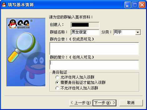 提示:日后要把其他的兄弟姐妹们加入到群中,只要在QQ主界面中单击“群/校友录”分组,接着单击右下角的“查找”按钮打开“查找添加群”窗口,选中“通过群的号码”,输入老大创建的“男生寝室”群号;然后选择该群,单击“下一步”继续,验证之后就可以加入到该群。