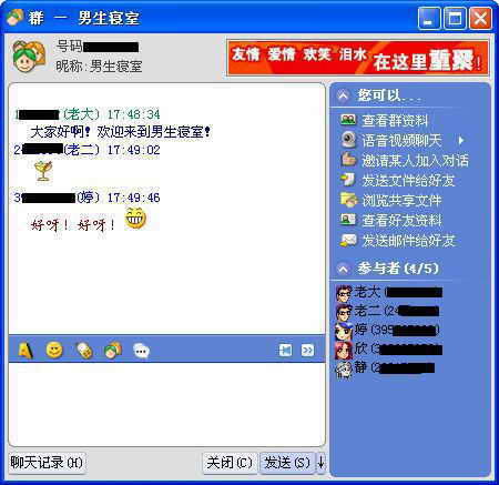 在老大的聊天计划中,准备利用QQ的群组功能将杏园寝室MM的QQ号和李园寝室的几个兄弟加入到群中,大家一起聊天,那多有气氛。