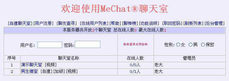 提示:因为使用的是免费版的MeChat,所以只提供一个固定聊天室和一个自建聊天室,而且每个聊天室最多30人。另外,免费版不支持管理、外部验证和立体声功能。