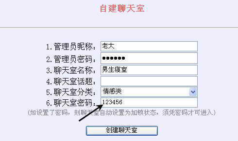 老大通过IE浏览器打开聊天室主窗口后,单击上方的“用户注册”栏目,接着在弹出的“注册个人资料”窗口中输入用户名、密码、年龄等信息,最后单击“开始注册”按钮完成用户注册。紧接着需要创建聊天室,在主窗口上方单击“自建聊天室”栏目,然后输入管理员昵称、密码,聊天室名称、分类等,单击“创建聊天室”按钮即可。
