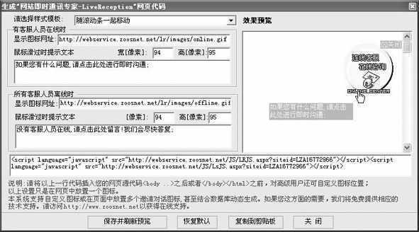 运行网站即时通讯专家,在登录口处输入申请的登录名、密码和账户开通邮件中的站点ID,然后单击“登录”按钮进入网站即时通讯专家客服端。我们需要先设置好呼叫中心的页面按钮才能实现与访问客户在线交流的功能。在网站即时通讯专家客服端依次执行“资料设置→生成网站即时通讯专家LiveReception网页代码”弹出代码设置窗口(图1),系统提供了“常用”和“随滚动条一起移动”两种页面按钮模板样式,可以根据需要选择一种,然后分别设置一下客服在线和离线时的按钮提示文本,整个设置过程中,在左边的预览框里可以预览到按钮图标的样式。设置完毕,你就可以将如下代码插入到要添加呼叫中心按钮的页面源代码<BODY></BODY>之间,你的网站呼叫中心页面按钮就设置成功了。