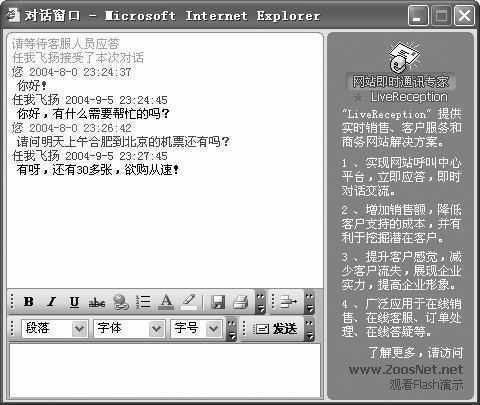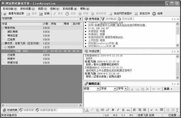 呼叫中心页面按钮设置好之后,当有访客点击了这个按钮时就会弹出对话窗口(图2),同时在客服端的窗口上提示有客户呼入并将这个呼入,自动排列到对话列表的“等待应答”栏目下,客服端工作人员只要先选中此呼入,然后单击工具栏上的“接受”按钮即可将这个呼入接进客服端,然后访客就可以与网站客服人员像使用QQ一样进行实时的交流了(图3)。