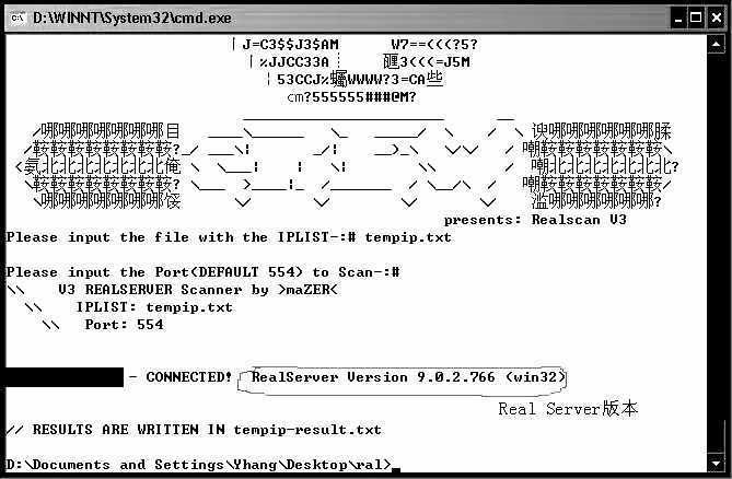 带着满腔愤怒拿出扫描器Super Scan4.0对网站狂扫。1分钟后,报告显示网站只开了80、21、554、3389端口。晕,开着80、21、3389端口是再正常不过的了,不过它为什么要开554端口呢?554不正是Real Server的端口吗。记得以前Real Server有个远程溢出漏洞,于是急忙下载了一个Real Server的溢出程序,里面还附带了一个专门针对Real Server溢出漏洞的扫描器(realscanv3)。由于Real Server漏洞只针对Real Helix Server9.0.2及以下版本,为了确认溢出程序对该网站是否有效,我利用自带扫描器对该网站的Real Server服务器又做了一次扫描,如图1。结果显示是Real Server9.0.2,哈哈,这下看你还不乖乖就范。