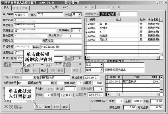 在主菜单上依次点击“数据处理→手工录入”,打开“客户资料录入及查询”窗口。窗口的上半部分是客户数据,下半部分为本次订票数据,分别点击“新增”和“录入”按钮便可以进行信息的输入。果冻将自己的个人资料以及国庆节出游需要购买的机票信息都“塞”进了订票系统(图2)。