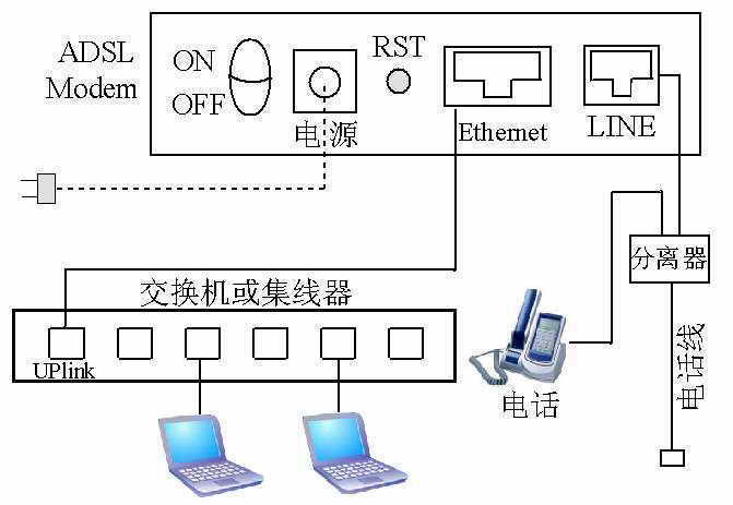 其实,我们可以使用ADSL Modem的内置拨号功能(带路由功能的ADSL Modem)来解决这个问题。如果ADSL Modem支持内置拨号功能,那么就可以设置几个简单的参数,使ADSL Modem通电后即可自动拨号,省却了计算机拨号的过程。但要注意,这种拨号方式需要先将ADSL Modem和Hub、交换机的UPLink插槽用平行网线相连,然后再将寝室中的所有电脑连接到除了UPLink口之外的任何一个接口即可(见图)。