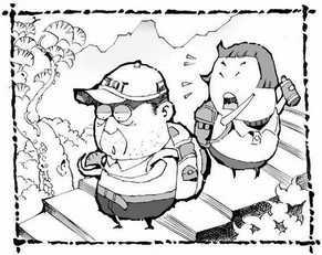 哎,以前“噔噔噔”几步就到顶了,现在怎么爬了老半天还在山腰啊?老爸累得两腿打颤,找了块石头坐下来:“不、不行,没HP了。咱们打道回府。不用再往上爬了吧?”
