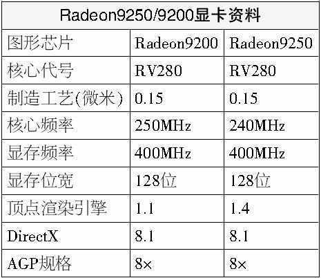 Radeon 9250在规格上与Radeon 9200基本相同,同样采用的是RV280核心,顶点渲染引擎从1.1升级到了1.4,核心频率降低了10MHz。完全支持DirectX8.1,相对只支持DirectX7的GeForce4 MX440系列有很大的优势。