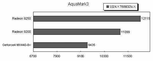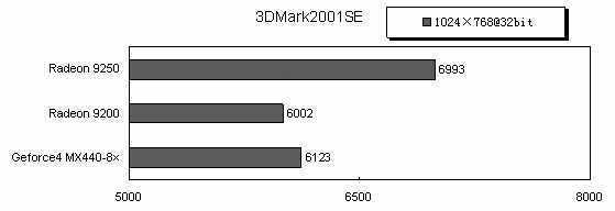 从成绩看Radeon9250的DirectX8性能还是比较出色,3DMark2001SE下的成绩远远超过了Radeon9200和GeForce4 MX440-8×。
