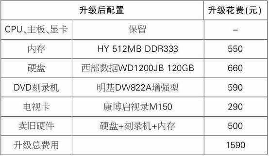 诸位的指导让我茅塞顿开,如果有钱的话我会把两个方案综合起来,只可惜预算有限,我想先解决老机压缩MPEG-1(VCD)格式文件速度慢的问题,因此只能选择比较适合自己的升级方案。方案1升级了大容量高速硬盘,更换了新的512MB内存,8速的DVD刻录机也算是主流产品,且康博的电视卡质量也不错。这里还是遵照编辑的意见,决定采纳方案1,毕竟眼前最紧迫的事是让Premiere流畅运行,有钱了再考虑升级主板和显卡吧。