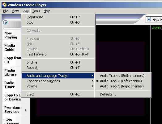 微软的Windows Media Player9.0(简称WMP)有切换声道的功能。以英文版WMP为例,点击菜单中的“Play”,再选择“Audi and Language Tracks”,在弹出来的菜单中Audio Track 1表示混合声;Audio Track 2表示左声道;Audio Track 3表示右声道;通过选择就可以切换声道 (图1) 。