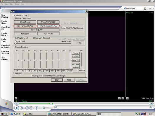 以WMP为例,安装此插件后,用WMP打开双语文件,插件就起作用了。看到图2中的“LEFT Channle to all”和“RIGHT Channle to all”选项了么?关键的功能在这里了。如果要将右声道的声音屏蔽掉,点击“LEFT CHANNLE TO ALL”,右边音箱的国语配音就被覆盖了。