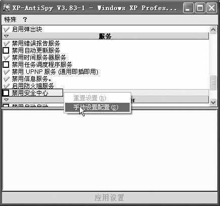 运行XP-AntiSpy,在主窗口中找到“服务”栏的“禁用安全中心”选项(如图),右键点击该项,在弹出菜单中选择“手动设置配置”,稍等片刻后,就禁用了安全中心功能;要重新启用该功能,只要再次右键单击该项,选择“重置设置”选项即可。