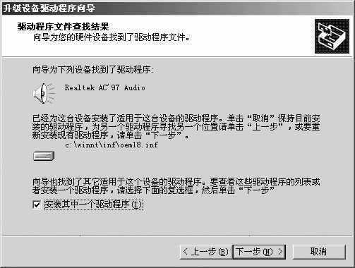 在“安装其中一个驱动程序”前打钩,点下一步,这时出现如图3的界面,原来在这里可以有更多的选择。我选择了“C-Media AC'97 Audio Device”,安装完驱动后重启电脑,熟悉的音乐又响了起来。
