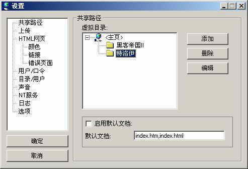 第二步,单击窗口左侧的“设置”按钮打开设置窗口,可以对共享路径、上传路径、HTML网页、用户/口令、目录/用户、NT服务等进行设置。比如选择“共享路径”,在右侧的窗口中就可以单击“添加”按钮来添加其他更多的虚拟目录(图1)这些目录在共享给网络用户时都可以看到和访问的;选择“上传”,设置是否可以上传文件,单击“浏览”按钮来设置上传目录;选择“HTML网页”,可以在右侧的窗口中设置HTML网页标题;