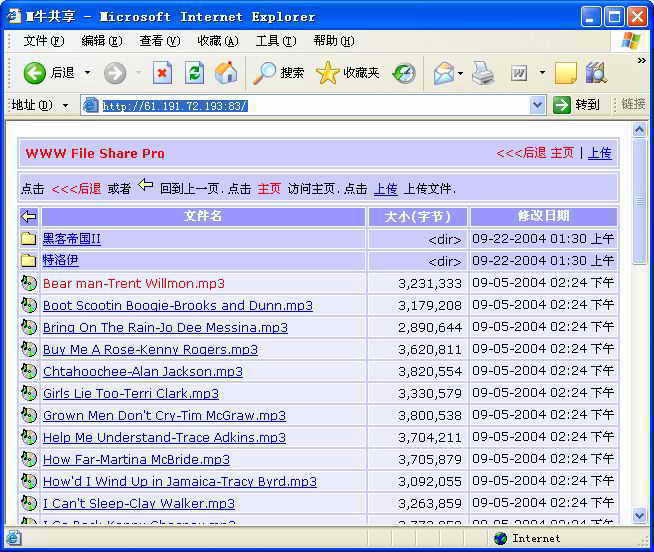 在启动服务器的时候,M牛记下了主窗口“共享目录”下方的网址,并将这个网址告诉了MM。这样,MM只要使用IE浏览器打开该网址就可以访问该服务器(图2)。