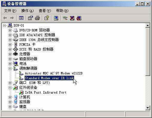 GPRS手机可使用红外、蓝牙、USB或串口数据线与笔记本电脑相连,其中红外和蓝牙连接较为方便。下面以红外为例。首先要开启手机的红外端口,将它与笔记本电脑的红外端口相对,笔记本电脑即会提示发现红外设备,并会自动安装它的驱动程序(或插入驱动盘安装)。驱动程序安装完成之后,你会发现系统中多了一个“Standard Modem over IR link”的设备(因机型而异,见图2)。