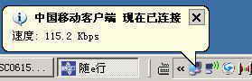运行随e行客户端程序后(图4),如果存在多种无线上网设备,可选择“手动连接”,否则选择“自动连接”。在“手动连接”对话框(图5)中,选择连接方式为GPRS,连接设备为GPRS手机或GPRS无线上网卡。单击“连接”按钮即可开始拨号。拨号成功后会在系统托盘区显示连接的速度(图6)。