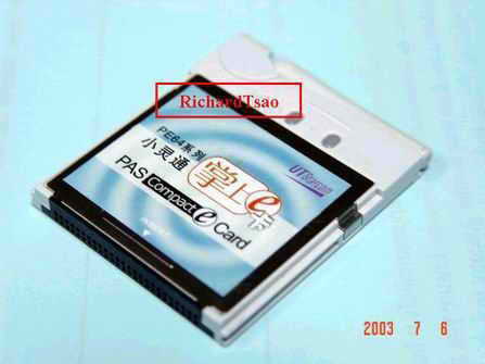 小灵通掌上e卡是世界上最小最轻的PHS终端,尺寸为42.8mm×51.4mm×5.0 mm,重量仅17g。它内置了RF收发器,无须再与小灵通配合,从而直接实现无线移动上网的功能。支持32Kbps/64Kbps速率的数据通讯,采用支持CF型Ⅱ接口,能方便地插入PDA和笔记本电脑中(另需转接器)。参考价:800元。