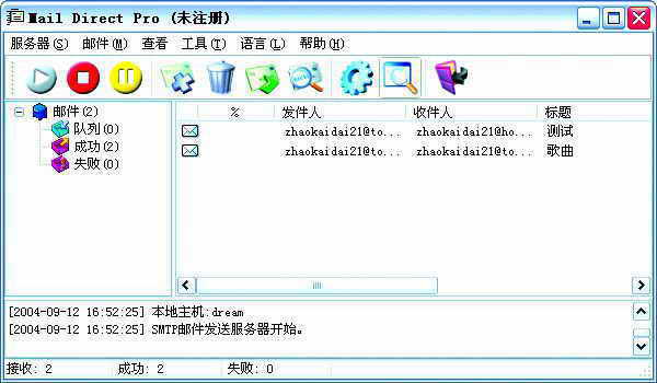 如果你使用其他的邮件客户端程序,也可以按照类似的方法进行设置。发送的邮件信息,我们可以在Mail Direct中直接查看,如图2所示: