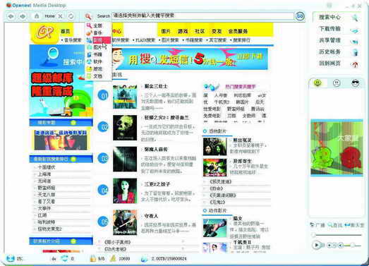 OP的下载地址是:www.op.cn。经过简单的注册后就可以登录到OP的主界面。在主界面显示有五个区域,它们分别是:导航菜单,在此区域点击不同的选项可以执行不同的功能;好友列表,在此可以进行添加、删除联系人,与朋友进行语音、视频、文字聊天;当前信息,位于主界面的底部,会随时显示可以查询的共享文件数量、当前用户财富(石头)等信息;搜索栏,在此输入相关信息可以进行所需文件的搜索;媒体文件播放控制区,对所下载文件进行预览播放。