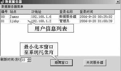 数据服务器运行后将会打开一个列表窗口,其中列出了正在连接主机的客户端信息(图1)。我们可以点击“隐藏窗口”按钮将它最小化到系统托盘内。