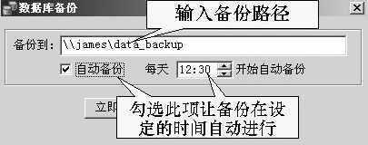 在主机上的服务器端程序窗口点击菜单栏上的“数据服务器菜单→数据备份”,打开“数据库备份”窗口。在“数据库备份”窗口的输入框中输入备份路径并勾选“自动备份”选项便可以实现自动备份(图3)。当然,备份的路径可以是本机,也可以是局域网上的其他电脑(如“\\james\data_backup”)。