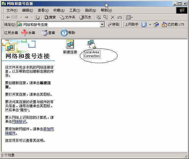 Step4:在“interface ip>”提示符下输入“add address “Local Area Connec tion” 10.0.0.2 255.0.0.0”来修改远程计算机的IP地址为10.0.0.2,子网掩码为255.0.0.0。值得注意的是Local Area Connection是本地连接的名称(图2),在实际应用中,用户可将“Local Area Con nection”替换为其他的网络连接名称。如果网络连接名为“本地连接1”,那么就应该输入“add address “本地连接1” 10.0.0.2 255.0.0.0”。