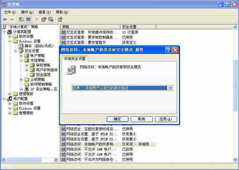 解决这个问题只要对相应的组策略选项进行修改即可。点击“开始→运行”,在“运行”对话框中输入“gpedit.msc”命令并回车,弹出组策略编辑器窗口,依次展开“本地计算机策略→计算机配置→Windows设置→安全设置→本地策略→安全选项”,在右侧框体中找到“网络访问:本地账户的共享和安全模式”(见图),双击打开,将它修改为“经典 - 本地用户以自己的身份验证”。最后,点击“确定”按钮,重新启动Windows XP系统即可。