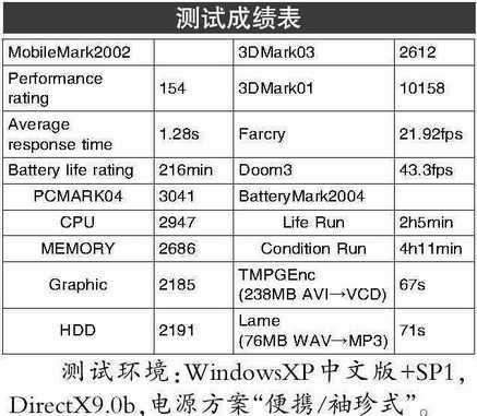 测试环境:Windows XP中文版+SP1,DirectX9.0b,电源方案“便携/袖珍式”。