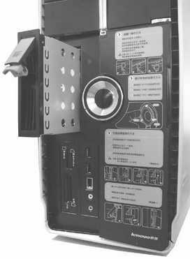 说到热拔插,大家很容易想到USB接口或IEEE1394接口的外接设备。而锋行K9000却在机器内部采用了热拔插设计。这就是我们前面说的硬盘热拔插。打开前置功能扩展接口面板,上面有一个绿色的卡扣,用手指扣住这个卡扣的下边往外拉,就可以把整个硬盘架(连同硬盘)一起拔出来,这个硬盘是整个系统中两个SATA硬盘中的一个,也是从盘。热拔插硬盘对于需要经常处理大量数据资料的用户来说,还是非常方便的。