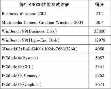 由于采用了P4 3.4GHz Prescott处理器、1GB的DDR400内存,以及128MB/128bit规格的ATi Radeon X600显卡,锋行K9000在1024×768的分辨率下,三种不同的画质的测试中游戏画面都还算流畅,打开游戏的全部特效,帧速在30fps左右。不过,当设置成更高的1600×1200分辨率时,RadeonX600显卡的先天不足就彻底暴露出来了。因此,如果K9000在显卡上能换成性能更好的X800或者NVIDIA GeForce6800的话,相信会赢得更多游戏爱好者的青睐。当然,前提是价格不能贵得离谱,最后笔者对锋行K9000进行了性能上的全面测试,测试结果详见附表。