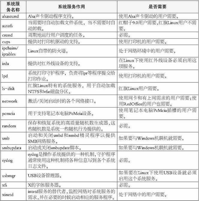 对于一般的桌面用户来说,只要在下表这些系统服务中进行选择就足够了(笔者在这里结合RedHat9的系统服务来进行说明):