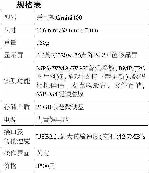 爱可视Gmini400,是一个最为时尚的典范,它有着“概念级”的漂亮外形和精细的做工,有出色的显示品质,可以浏览多种格式的图片,可以支持多格式的音乐播放,能够作为数码相机伴侣使用,而且速度极快,游戏的可玩度也非常高,操控性也非常好。但惟一的遗憾,也是一个巨大的遗憾是在播放MPEG4视频时,存在声话同步不佳的问题。如果修正了这一问题,那么它将是一款相当出色且极具性价比和购买价值的产品。