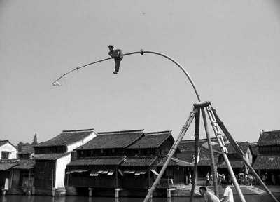 高竿船是桐乡一带特有的民间体育活动。在一条大船中央放置一个巨型石臼,上插一根硕大的毛竹。表演者爬上竹竿梢时,毛竹便弯成90度的钩形,在人体重力的作用下颤颤悠悠的,令观者的心也跟着颤悠。