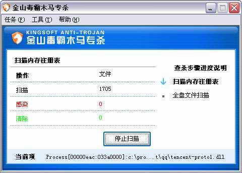 如果系统中已经安装了金山毒霸6增强版(从http://db.kingsoft.com/download/可以下载30天的试用版)的话,你就可以直接使用其中的木马专杀工具来彻底清除系统中的木马。