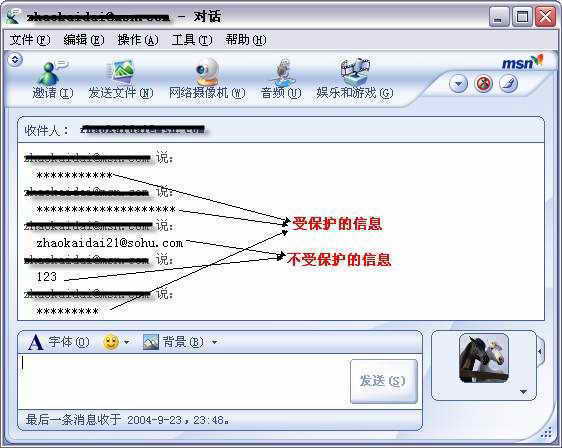 经过这样设置后,只要你在任何一个网页、邮件或是即时消息中输入与保护信息相关的内容后,诺顿会自动将它全部转换成“*”。图4所示的窗口就是试图给MSN好友发送受保护的密码信息的情况。在输入受保护的密码消息时,显示正常,一旦发送给对方,对方看到的却是被替换成“*”的信息了。