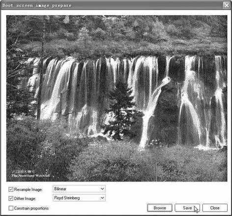在SkinStudio主窗口界面中选择“Tools→BootSkin→Prepare Image”命令,弹出“Boot screen image prepare”(制作开机画面)窗口,点击“Browse”按钮,在“打开”对话框的指定文件夹中选取nrl.jpg文件,接着点击“Save”按钮即可(图1)。