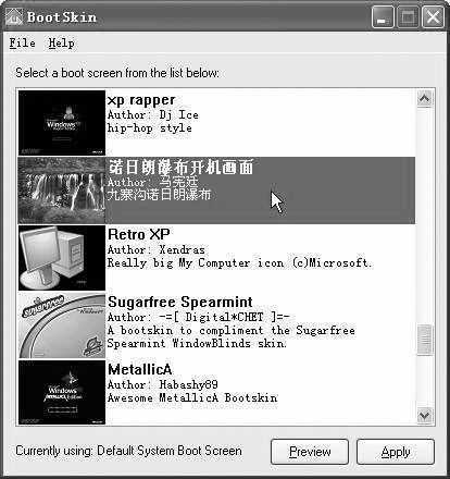 3.启动“BootSkin”,在主窗口界面的开机画面列表中,百合找到了刚刚制作的开机画面缩略图(图2),选中它,然后点击主窗口界面下方的“Preview”按钮,对该开机画面进行预览,点击鼠标或键盘上的任意键即可结束预览。预览完毕后就可以在主窗口界面上点击“Apply”按钮,完成更换。重新启动计算机,就可以看到新的开机画面了。