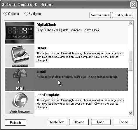 3.在“Desktop”选项卡中,点击“Object”栏中的“Load”按钮,打开“Select DesktopX object”选择窗口,DesktopX内置了十五种不同风格的“物件”,在列表中选择“Email”物件(图4),然后点击“Load”按钮,电子邮箱图标即刻被添加到桌面上,当把鼠标移动到它的上面时,呈动画效果,酷极了,这回百合给远在九寨沟的白鹭发邮件可就方便了。