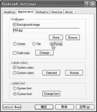 4.在“DesktopX Settings”窗口中选择“Appearance”(外观)选项卡,接着在“Wallpaper”框中勾选“Background image”,点击“Browse”按钮,弹出“打开”对话框,在指定的文件夹中选择白鹭发来的火花海照片,点击“打开”按钮,返回到“Appearance”选项卡,选择“Resize”选项,让图片覆盖整个桌面(图5)。
