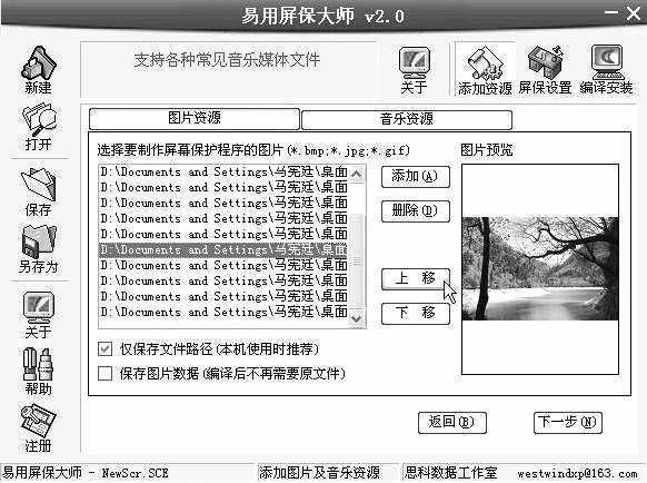 1.启动易用屏保大师,点击左侧的“新建”按钮,接着点击“图片资源→添加”按钮,弹出“请选择用来制作屏保的图片文件”对话框,在指定的文件夹中选择九寨沟五花海等的风景照片文件(*.bmp、*. jpg和*. gif等格式),最多可达 99个不同的图片文件。然后点击“打开”按钮,即可将图片文件添加到列表中,此时还可以在右侧的预览窗格中查看图片,点击“上移”或“下移”按钮,可以进一步调整列表中图片的位置(图7)。