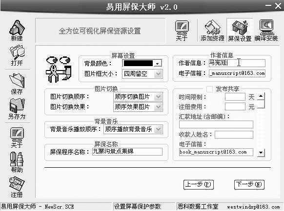 3.出现屏幕保护程序设置画面。屏幕保护程序的背景颜色、图片显示的顺序、图片切换效果的顺序,背景音乐播放顺序等,都可以自由地进行设置。百合为屏幕保护程序起了个名字──九寨沟景点集锦,并标注了自己的一些信息,准备最后把这个屏保发布以供更多的人欣赏(图8)。设置完毕后,点击“下一步”按钮继续。