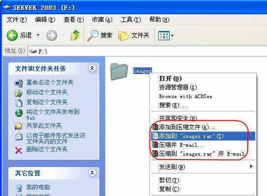 右键点击该文件夹弹出一个菜单,在上面可以看到“添加到压缩文件、添加到images.rar、压缩并E-mail、压缩到images.rar并E-mail”四个命令(图1)。