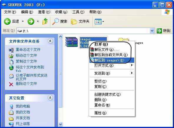 解压缩就是将压缩后的文件恢复到原来的样子,具体的操作方法也很简单:比如在“资源管理器”中,只要右键单击文件(比如上面提到的images.rar),那么会弹出一个包括有“打开、解压文件、解压到当前文件夹以及解压到images”四个命令的快捷菜单(图3)。