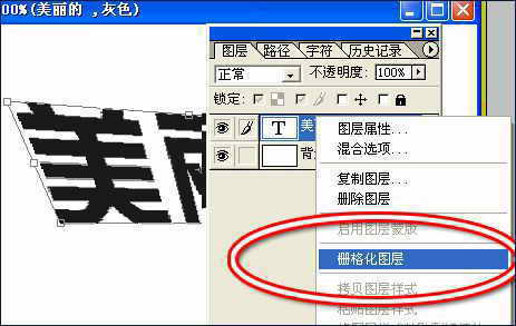 注意:在对文字作笔画上的填充时,首先要将文字图层转化为栅格化的位图,在Photoshop中是不能直接对输入的矢量文字做局部处理的。
