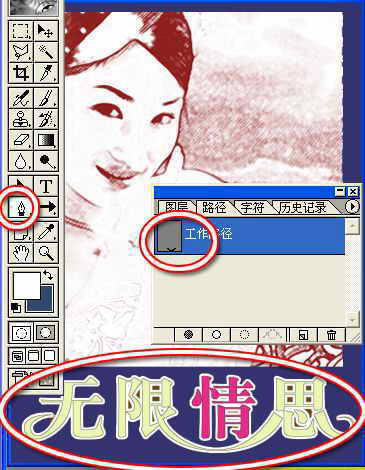在文字的现有基础上,加以夸张和巧妙的处理,往往会有意想不到的效果。如图4的“无限情思”,就是利用工具箱中的钢笔工具对部分笔画加以补充而来的。